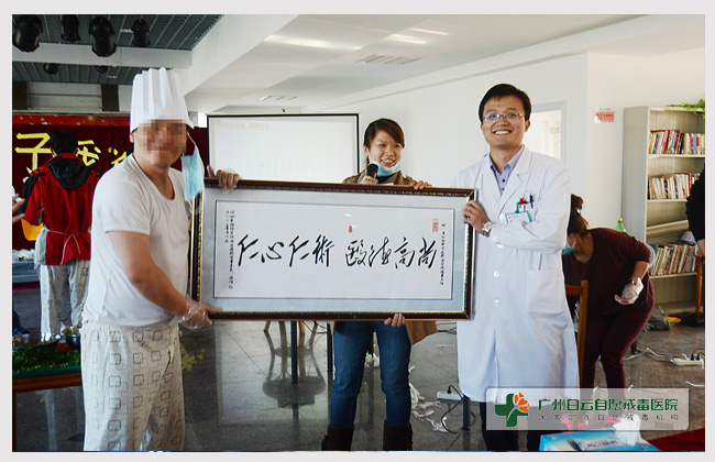 戒毒患者和家属分为三组进行包饺子比赛,比赛现场非常热闹。参赛选手都非常认真地做饺子馅、包饺子、煮饺子,争先恐后地把饺子端给评委品尝并为自己的队拉票。虽然是比赛但是大家都本着“友谊第一,比赛第二”的原则,整个白云戒毒大家庭其乐融融。比赛的最后,患者为戒毒医院住院部杨勇主任奉上了他们精心准备的牌匾,上面写着“仁心仁术,医德高尚”,又为戒毒三区的全体医护人员奉上了他们自己题的词“妙手回春仁医道,诚挚呵护天使心”。