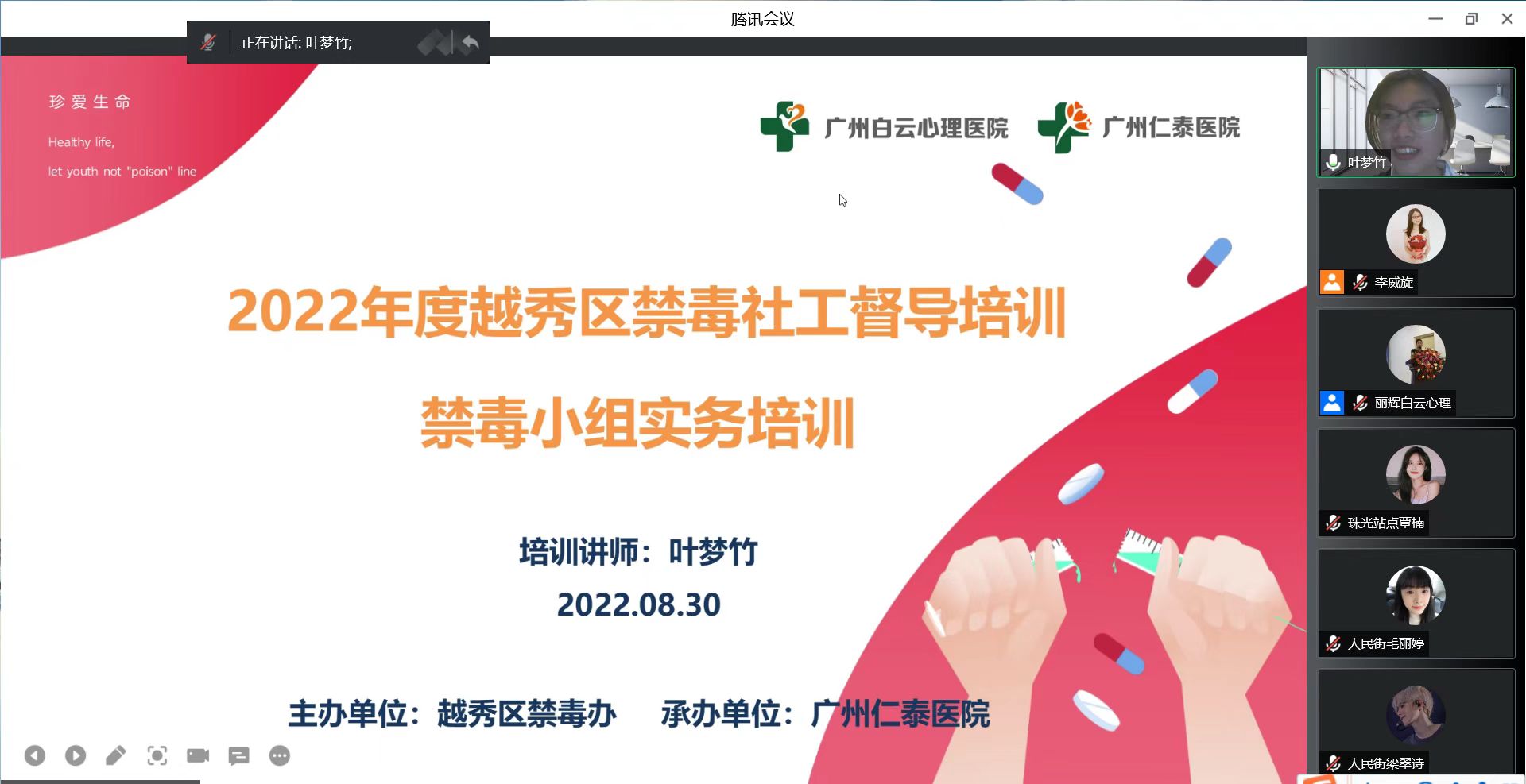 8月30日,广州市公安局越秀区分局禁毒社工督导培训服务项目开展了线上培训活动,培训由越秀区禁毒办和广州仁泰医院联合举办,来自全区60多名禁毒社工参加了培训。